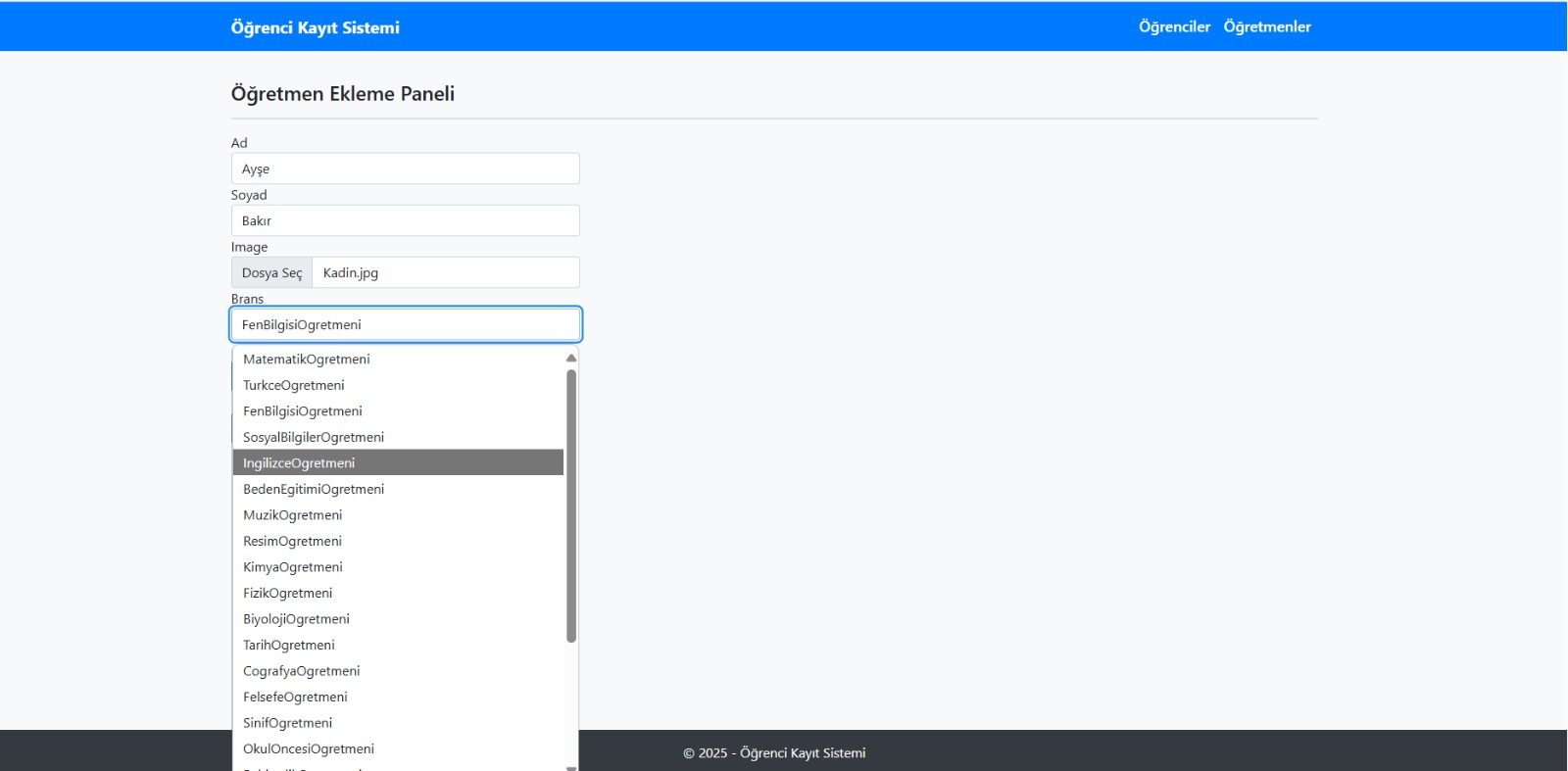 Bu proje, katmanlı mimari prensiplerine uygun olarak geliştirilmiş, öğrenci ve öğretmen yönetimini içeren bir ASP.NET Core MVC uygulamasıdır. Kod yapısı; Business, DataAccess, Entities ve Presentation olmak üzere dört ana katmandan oluşur. Business katmanı, uygulamanın iş kurallarını ve servis mantığını barındırırken; DataAccess katmanı, Entity Framework Core kullanılarak veri işlemlerinin yapıldığı yerdir. Entities katmanı, veri modellerini, DTO’ları ve enum tanımlarını içerirken; Presentation katmanı, ASP.NET Core MVC teknolojisiyle oluşturulmuş kullanıcı arayüzünü sunar. Projede; öğrenci kayıt, listeleme ve güncelleme, öğretmen bilgisi yönetimi, enum tabanlı cinsiyet, sınıf ve branş seçimi gibi işlemler gerçekleştirilebilir. Katmanlar arası geçişlerde Repository pattern ve Dependency Injection prensipleri kullanılmıştır. Bu sayede yapı sürdürülebilir, test edilebilir ve genişletilebilir hale getirilmiştir. Arayüz kısmında ise Razor View'lar ile kullanıcı dostu bir deneyim sağlanmıştır. Kullanılan teknolojiler arasında ASP.NET Core MVC, Entity Framework Core, SOLID prensipleri ve IoC Container ile yönetilen servis mimarisi yer almaktadır.